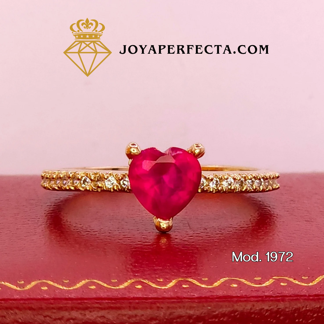 Este anillo captura el romanticismo en su forma más pura. 🥰💍 Forjado en oro de 10 kilates, su centro está protagonizado por una gema tipo rubí en corte corazón, símbolo eterno del amor verdadero. 💎❤️ A los costados, un elegante camino de zirconias laterales aporta brillo, contraste y profundidad, como si cada destello acompañara un latido. ✨🌟❤️